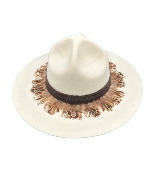 The CATALINA Fedora blends vintage retro flair with modern craftsmanship. Handcrafted from premium Bolivian wool felt, its sculptural bone tone crown is decorated with a natural feather hatband framed by brown embossed vegan leather for a richly artistic finish.