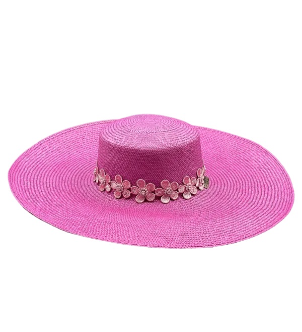 The FLOR Hat is an elegant cordovez silhouette handcrafted in lilac toquilla straw, radiating timeless charm and refined beauty. Finished with a delicate floral lace trim band in soft lilac hues, this wide brim design brings an ethereal, feminine accent to its classic structure.
