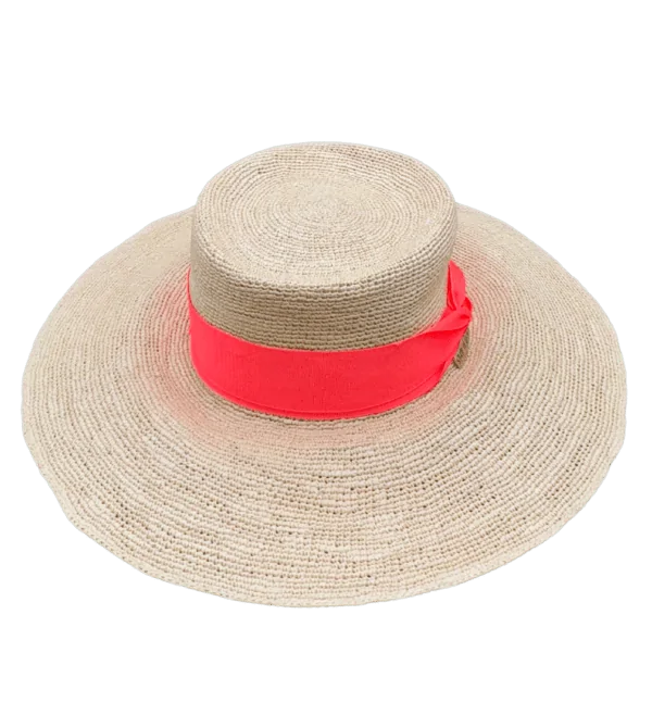 The MAYTE Hat is a refined cordovez silhouette handcrafted in natural crochet toquilla straw, showcasing exceptional artisanal craftsmanship. Finished with a vibrant orange grosgrain ribbon, this wide brim design brings a bold yet sophisticated accent to its classic form.